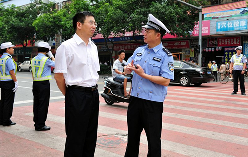 ????6月7日上午,副市長、公安局局長補(bǔ)祥斌到梧州高中考點(diǎn)了解現(xiàn)場交通疏導(dǎo)情況,并看望一線作戰(zhàn)的交警。石桂暉/攝