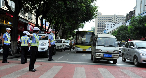 ????今年高考適逢西江大橋封閉維修,繞道云龍橋進(jìn)入市區(qū)的車輛與河西往河?xùn)|的車輛將在鴛江橋、桂江一橋兩邊橋頭形成交通沖突點(diǎn),文瀾路建行路口、大學(xué)路軍分區(qū)路口、中山路香港城路口交通壓力將會增大,而梧州高中、梧州一中兩個(gè)高考考點(diǎn)就位于這幾個(gè)路口之間,可以說,高考道路交通安全保衛(wèi)工作的成敗就系于這幾個(gè)路口交通的疏堵。為此,梧州市公安局交警支隊(duì)在這三個(gè)路口屯守重兵疏導(dǎo)交通,在可能影響這三個(gè)路口交通流量的西江路、西堤路、富民路、新興路等主干道的十字路口,也派出民警把守,通過對講機(jī)將各個(gè)關(guān)鍵節(jié)點(diǎn)的警力連結(jié)成網(wǎng),合成作戰(zhàn)。