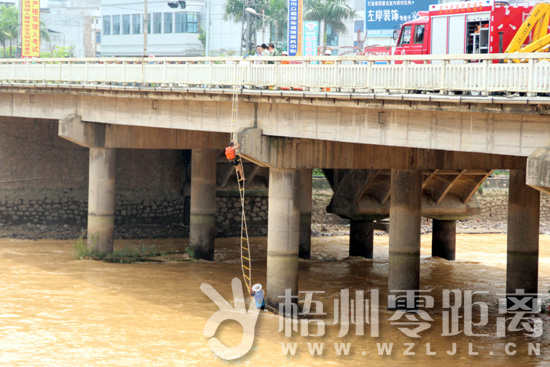 當日9時30分許,岑溪大隊接到報警后,立即派出1輛搶險救援車,6名官兵趕赴事發地岑溪大橋。只見一頭戴草帽的男子站在大橋位于義昌江江心的橋墩下,大腿以下都被淹沒在江水中。近期連日降雨,江水渾濁湍急,男子只有扶住橋墩,靠橋墩減緩洪水的沖擊才能站穩,稍一移步,就有被江水沖走的危險。男子被困處離江岸太遠,從岸邊涉水救人危險性大。消防員經觀察發現,大橋約7至8米高,可使用救生軟梯從大橋上下降至男子被困處救人。消防員在大橋上找準男子被困處正上方的橋段,放下軟梯,攜帶安全繩沿軟梯下到男子處,為被困男子系上安全繩,并固定軟梯下端,防止軟梯擺動影響安全攀爬。被困男子在消防員的幫助下順梯慢慢爬上大橋,安全獲救。整個救援過程僅用時5分鐘。