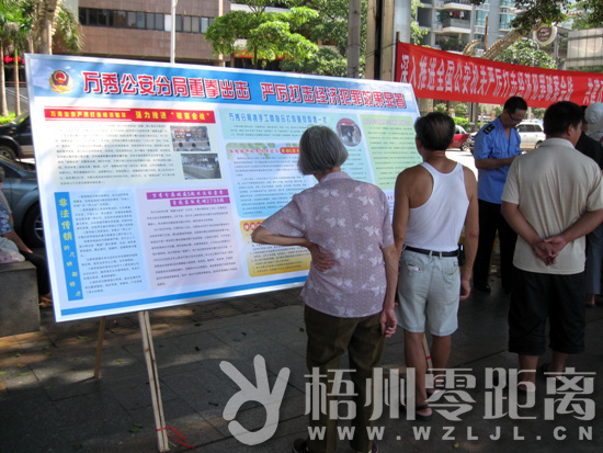 梧州零距離網(wǎng)訊(通訊員 陳巧良)6月18日,梧州市公安局萬秀區(qū)分局與萬秀區(qū)工商局、中國(guó)人民銀行梧州分行攜手在市鴛江麗巷廣場(chǎng)開展了以“嚴(yán)厲打擊經(jīng)濟(jì)犯罪,強(qiáng)力推進(jìn)‘破案會(huì)戰(zhàn)’”為主題的集中宣傳活動(dòng)。活動(dòng)通過發(fā)放宣傳資料、接受市民咨詢、講解辨假知識(shí)等方式向市民宣傳