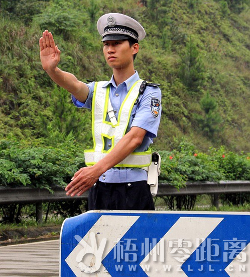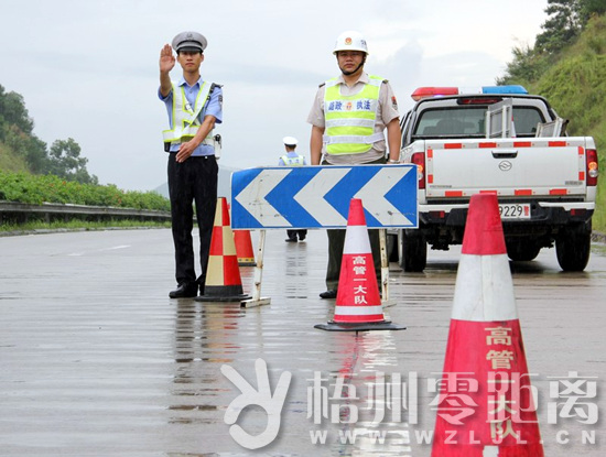 梧州交警高速一、三大隊民警聞警而動,火速啟動《高速公路防汛救災搶險應急預案》,拉響警笛在雨中奔赴現場。到達發生水毀險情的道路前200米位置后,大隊長林志輝和梁寧康分別指揮本大隊的隊員們擺放改道標志牌、減速標志牌、反光錐桶,實施險情路面單車道通行。同時進行交通疏導指揮、現場保護和對過往車輛司機進行情況說明,并引導其減速慢行安全通過。配合路政應急搶險小組對道路隱患進行搶修處置。風雨中,高速民警和其他搶險處置部門的人員一起,發揚不怕苦、不怕累的精神,經過一個小時的努力,水毀險情得以控制,現場處理完畢后恢復雙車道通車,高速大隊領導及時向媒體發布事故現場最新路況,解除了險情警報。