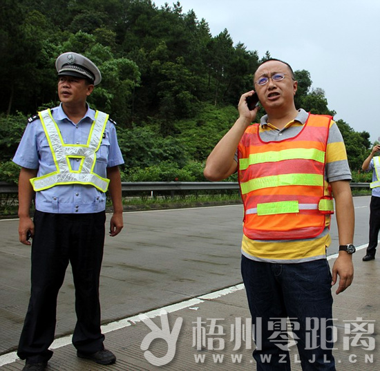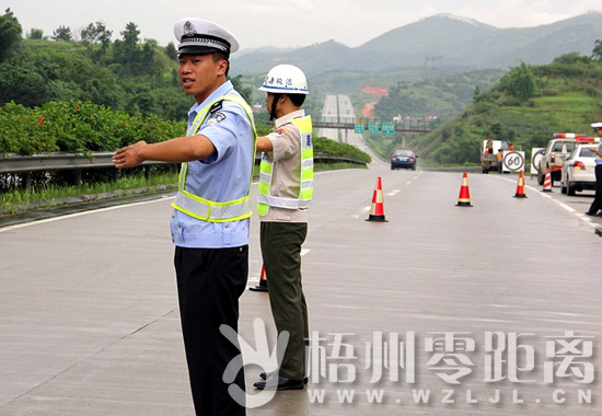 6月25日上午九時,梧州交警支隊高速一、三大隊民警聯合岑梧高速公司、路政等部門在包茂高速公路G65 K2790+500M進行一次水毀險情的應急預案演練。石桂暉 黃寧 攝
