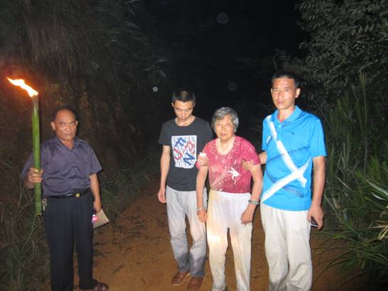 民警耐心地向這位老婦人詢問情況,無奈老婦人卻不能正確回答民警的提問,民警只好舉起火把小心翼翼地把這老婦人扶下山接回所內安置。在派出所內,民警給老人端來熱茶,送上可口的飯菜,再次耐心細致地詢問她的情況,經過長時間的詢問才得知她叫彭玉蘭是江蘇人,今年77歲了,是隨女兒來到岑溪的,今天早上外出,走著走著就到山里,現不知道怎樣回家。