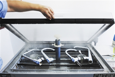 水龍頭鹽霧試驗(yàn)中,質(zhì)量不好的水龍頭表面會(huì)產(chǎn)生“銅綠”、黑色斑點(diǎn)或腐蝕。 新京報(bào)記者 尹亞飛 攝