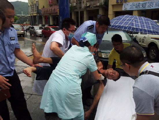 只見老漢半臥半趴地靠著路邊電線桿暈迷不醒,臉色發(fā)青,雙眼緊閉,口中還不時(shí)地吐著清口水。雨水打在他的身上,老漢不停地顫抖著。民警見狀,一邊用手機(jī)撥手120,請(qǐng)求救護(hù)車到場救助,一邊從車?yán)锬贸鲇陚悖徒?jīng)過的熱心小伙子一起,為老漢擋住打在其身上的雨水。兩分鐘后,救護(hù)車趕到現(xiàn)場,孟警官協(xié)助醫(yī)生、護(hù)士們將老漢扶上擔(dān)架,送往醫(yī)院救治。 |