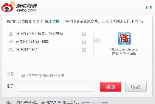 ????2、在彈出窗口中按提示輸入新浪的賬號和密碼,點擊連接按鈕,便可完成綁定。(注意:有的瀏覽器會禁止彈出窗口)
