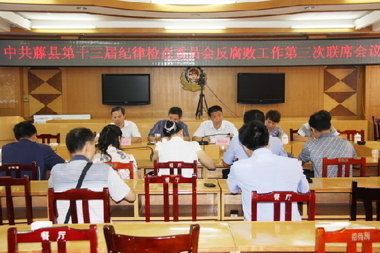 梧州零距離網(wǎng)訊(通訊員 朱庭源)9月19日下午,中共藤縣第十三屆紀(jì)律檢查委員會(huì)反腐敗工作第三次聯(lián)席會(huì)議在藤縣公安局電視電話會(huì)議室召開。縣委常委、紀(jì)委書記陳海深出席會(huì)議并作重要講話,縣委常委、組織部長陳堅(jiān)到會(huì)指導(dǎo),副縣長、公安局黨委書記、局長林峰以及縣紀(jì)委、監(jiān)察局、公安局、人民檢察院、法院、審計(jì)局等單位主要領(lǐng)導(dǎo)和紀(jì)委書記(紀(jì)檢組長)以及辦公室主任參加了會(huì)議。
