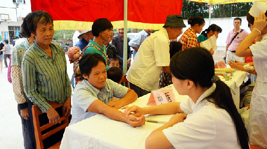 市婦幼保健院的醫(yī)護(hù)人員為村民把脈。黃祎婧/攝