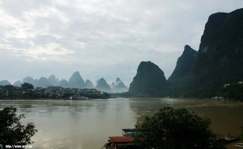 ????西街上偶遇到幾個人影,也是慢騰騰的,似乎沒有醒來。到得漓江邊,涼風習習,大霧鎖江,也只有一漁翁,一游客,三兩環衛工人在工作而已。煙波中有一小游船由遠而近,船家熱情請我晨游漓江,想像在這煙波浩渺中穿云破霧,如水泊梁山英雄般的來去自如,也有一股豪情。可惜時間不夠,只得作罷。