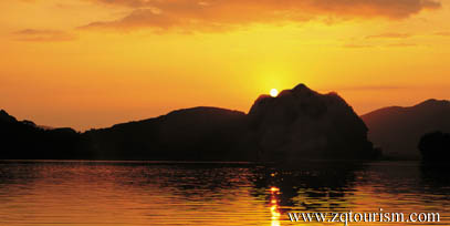 ????傍晚時分,站在新擴建的觀佛臺上向西望去,一大臥佛仰臥在波光浩瀚的湖面上,夕陽仿如一顆金光燦燦的仙丹,徐徐落進臥佛微張的嘴里,令人嘆為觀止,此時,臥佛仿佛蓋上了一層薄薄的輕紗,輕霧飄逸,如致仙境…