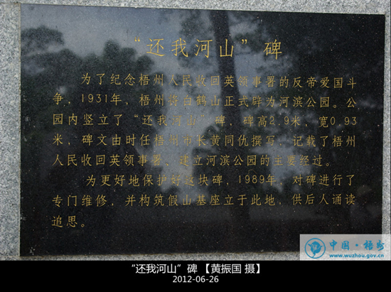 ????民國十一年(1922年)一月,香港海員大罷工,梧州海員積極響應,成立“省港輪船工會梧州分會”,進行一個多月的罷工,梧港交通為之中斷,沉重打擊了英國勢力。“五卅”、“沙基”慘案、香港大罷工相繼爆發后,梧州人民積極投入反帝愛國運動,組織梧州各界對外協會,到梧州善后處及廣西交涉署請愿,實行對日經濟絕交,檢查沒收英日貨物,各校學生舉行大規模示威游行,堅決要求取消外國在梧州的特權。1925年,“五卅”一周年紀念日,梧州各界聲援上?!拔遑Α边\動和廣州沙基慘案,舉行示威游行,游行群眾包圍英國駐梧州領事署,抗議英方暴行。“所有在英領署工作的華人,一律都辭退出來,弄得英國領事很驚慌的逃下兵艦,退回香港,以后一直不敢回來。------因為沒有中國人的幫助,尤其是住在那相當高的山頭上,食飯挑水,都成問題。”(黃紹竑:《五十回憶》)英國領事撤走后,領事署房屋園林內人管理,一天天的崩敗荒蕪下去。英國政府為此事多次同廣西省當局交涉。1928年春,市政府提議,援照廣東收回英領署案,呈請省政府轉咨兩廣交涉署,由省政府補回建筑費港幣2萬5千元,無條件收回。同年底,廣西省府主席黃紹竑到廣州,英國駐廣州總領事壁約翰到黃紹竑的公館葵園同他交涉,愿意將梧州的英領事署交還中國。廣東省交涉員朱兆莘代表廣西省同壁約翰談判,英方要求索回房屋建筑費2.5萬港幣。黃紹竑當即命人交款給壁約翰,英領事退回英文正本一份、契約二份。十二月十一日,朱兆莘交涉員復函給壁約翰“關于讓回梧州英領署產業一案,附契據二件,均經閱悉,本交涉員當即將此案換文,連同契據等件,就近送交廣西省府黃主席紹竑接收?!笔諒臀嘀萦㈩I署,“英國的政治勢力退出了廣西。”(黃紹竑:《五十回憶》)1929年夏,粵桂構兵,英領事舊址常為軍隊駐扎。1930年7月,市政府呈準辟為公園。1931年3月,舉行開幕典禮,名曰“河濱公園”。1932年,領事署旁豎有“還我河山”石碑,敘述梧州人民反帝斗爭驅逐英領事人員和購回領事署建筑、建立河濱公園的經過。