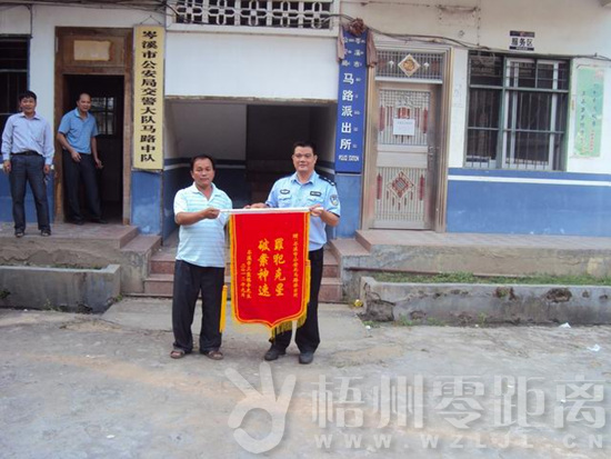 梧州零距離網訊(通訊員 林耀永 張宏濤)10月12日下午,岑溪市三堡鎮的群眾李某將一面印著“罪犯克星 破案神速”的錦旗送到岑溪市公安局馬路派出所所長黎洪元的手里,以表達對公安民警的感謝之情。