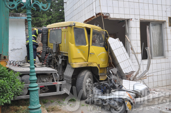 在事故現(xiàn)場看到,一輛未裝載貨物的貨車在出廠口的斜坡上撞上了廠區(qū)門口右邊的值班室,貨車車頭已完全變形,值班室的一角墻壁已被撞倒,還有一輛停放在值班室側(cè)面的摩托車也被撞倒在旁邊,地面上均是被撞碎的玻璃、車頭零部件和磚塊等,一片狼藉。貨車司機被卡在了變形的車頭內(nèi)下半身無法動彈,但神志還很清醒。經(jīng)過消防官兵利用液壓剪和擴張器等工具5分鐘左右的救援,成功將被困司機救出。