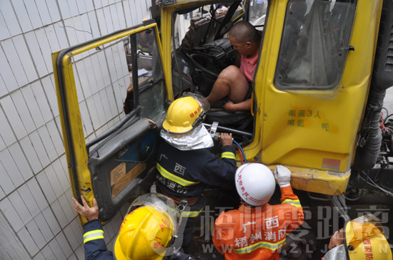 梧州零距離網(wǎng)訊(通訊員 通訊員 李研銘)10月17日上午9時25分,廣西梧州市廣東路38號一廠區(qū)門口發(fā)生一起貨車撞值班室事故,貨車司機被困駕駛室,梧州市公安消防支隊長洲大隊接警后迅速出動1輛水罐消防車1輛搶險救援車趕赴現(xiàn)場處置,經(jīng)過5分鐘左右的緊張救援成功將被困 司機救出,司機只有手臂被輕微擦傷,值班室人員躲避及時在貨車撞擊前跑出值班室,兩人均無大礙。