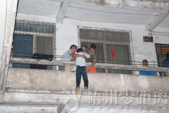 當晚23時35分,岑溪市110指揮中心接到報警,稱北環大道一居民區內有一男孩正爬在二樓走廊護欄外,準備跳樓。接報后,110指揮中心迅速調集消防大隊和轄區派出所前往現場,當消防官兵和民警趕到該居民區大門口時,只見里面樓房二樓的護欄外站著一名10歲左右的男孩,單手抓著護欄,十分危險。民警準備上前與其對話,但一看到民警男孩情緒更加激動,救援人員不敢輕舉妄動。隨后,消防員趁著夜色順著墻角沿樓梯悄悄的上至二樓,但還沒靠近男孩就被其發現行蹤,只好撤回。經過救援人員現場商討營救方案,決定由一名男孩熟悉的群眾在對面與他對話,分散其注意力,消防員趁機迅速將墊子搬到男孩底下,預防男孩往下跳,同時,正在與男孩對話的群眾和消防員立即上前將其緊緊抓住,避免了一場悲劇的發生。