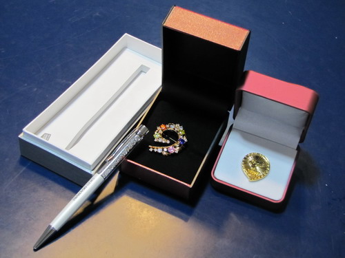 ??? 近日,第九屆梧州國際寶石節專用禮品確定,包括紀念徽章、胸花、筆、書畫冊、“兩節一會”會刊和六堡茶等,為禮品種類最多的一屆。圖為徽章、胸花和筆。 陳曉雯/攝