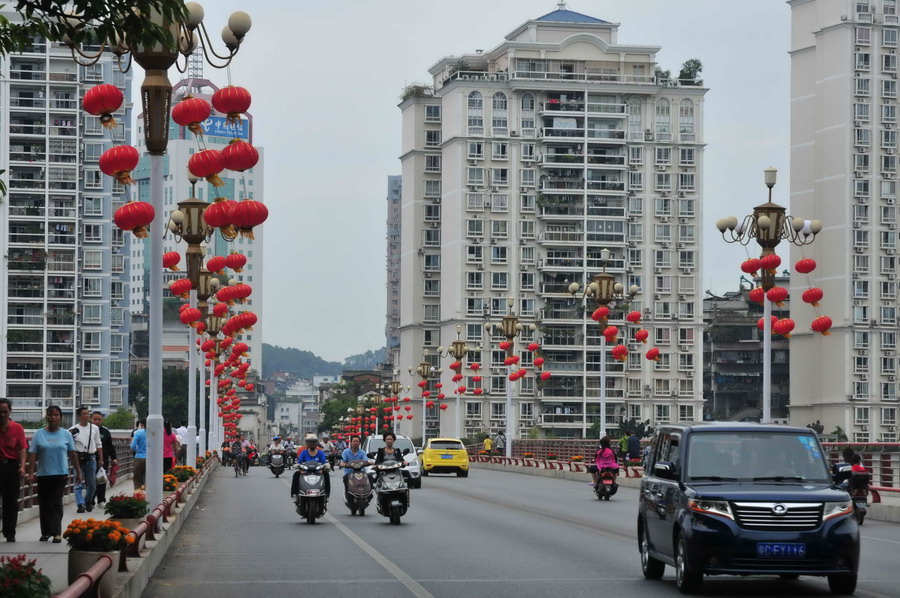 ????10月28日,在桂江一橋,高高掛起的紅燈籠讓人感覺到了喜慶的節(jié)日氣氛。近日,梧州市區(qū)主要街道已陸續(xù)布滿了鮮花、張掛了燈籠,第九屆梧州國際寶石節(jié)的氣氛已經(jīng)漸漸顯現(xiàn)。李煜榮/攝