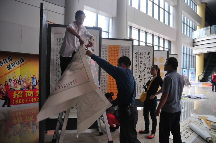 ????10月30日,第九屆梧州國際寶石節(jié)“古郡璀璨”詩書畫影作品展在市文化展覽中心影視廳前布展。