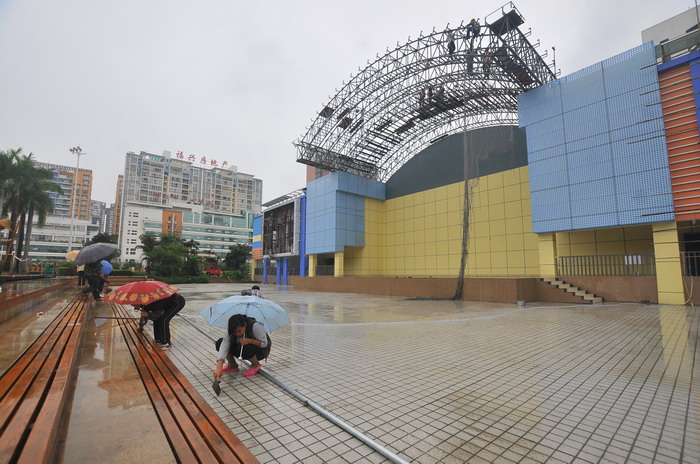 ????10月30日,工人冒雨清潔市政廣場(chǎng)小舞臺(tái)周邊的地面。