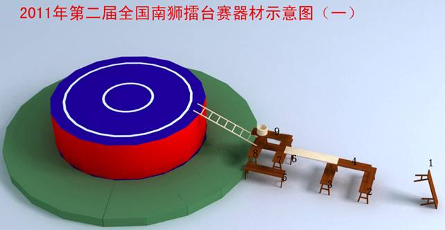 ????1、擂臺為圓形,規格:高度為1.5米,直徑7米。(擂臺中間標有直徑2米的圓形分隔區,擂臺邊緣設立距離臺邊0.5米的圓形下臺警戒線)比賽開始前,雙方舞獅運動員不得進入分隔區。