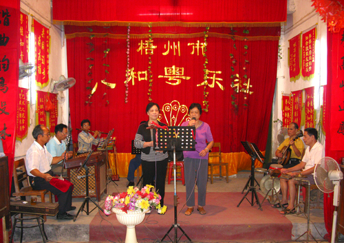 ????然而,梧州最初有私伙局的出現,可追溯到1912年。那一年,梧州最早的曲藝團體“樂樂樂”成立,在隨后的幾十年間,梧州的曲藝活動發展迎來了全新時期。樂和社、凱社、韶社、半閑樂社、鹽業工會俱樂部和中山室等一批樂社陸續成立,這些團體的組成人員大都是退休的老年人,他們喜歡唱粵曲,喜歡和知己同好相聚在一起自備樂器吹拉彈唱。他們或在街頭尋一塊空地,或受邀走進酒樓等地演出,或相約室內自娛自樂,這便是梧州粵劇私伙局發展的最初狀態。