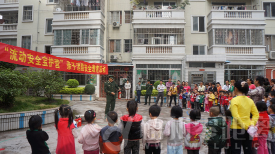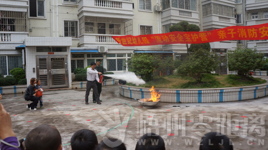 家長在消防官兵的指導下使用滅火器。覃燕霞 攝