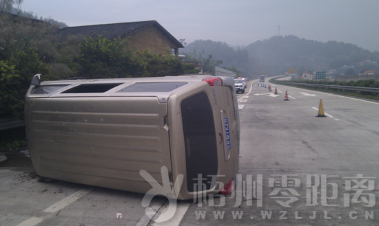 11月19日,重慶市江津市油溪鎮(zhèn)永竹村4組蔡增旭駕駛粵AB7X28號(hào)小客車,搭載7名親朋戚友從重慶往廣州探親。6時(shí)20分許,當(dāng)?shù)竭_(dá)廣昆高速G80線下行線玉林往岑溪方283公里+900米處時(shí),由于駕駛員在高速行駛時(shí)因操作不當(dāng),致使車輛撞擊公路右邊護(hù)欄后側(cè)翻在公路路面上,該事故導(dǎo)致車輛及路產(chǎn)受損,4人受輕微傷,幸無人員死亡。