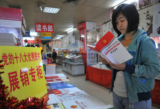 ????11月19日,在太陽廣場新華書店,一名市民正在翻閱學(xué)習(xí)黨的十八大精神的輔導(dǎo)讀本。 黨的十八召開以來,大會報告和其他重要文件廣受人們關(guān)注。近日,大會重要文件的單行本和學(xué)習(xí)輔導(dǎo)讀本相繼出版發(fā)行,市新華書店及時組織購進相關(guān)書籍,并設(shè)置展銷專柜,以吸引和方便讀者選購。 李鴻榮 攝