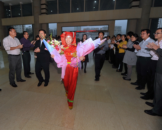 ????昨日下午4時許,市委副書記全桂壽和來自市各機關(guān)單位的數(shù)十名干部職工列隊在市聯(lián)合辦公大樓大廳等候。十八大代表抵達時,現(xiàn)場響起了熱烈的掌聲,全桂壽熱情地迎上前與黨代表親切握手,機關(guān)干部代表送上了鮮花,對他們載譽歸來表示熱烈歡迎和祝賀。