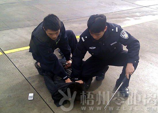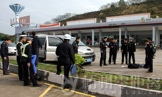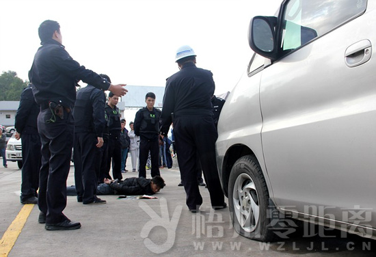 很快,一輛灰色面包車高速朝收費(fèi)站方向飛馳而來(lái),后面一輛廣東牌照的警車呼嘯著警笛緊緊跟著,面包車駕駛員見(jiàn)前面收費(fèi)站有警察嚴(yán)陣以待,無(wú)路可逃之際轉(zhuǎn)彎駛?cè)肱赃叺姆?wù)區(qū),車一停下兩男子打開車門奪路而逃。民警見(jiàn)狀立刻徒步飛奔過(guò)去,和廣東牌照警車下來(lái)的民警一道對(duì)兩嫌疑人展開圍捕,很快,經(jīng)過(guò)抱膝摔等幾招漂亮的擒拿動(dòng)作,兩名嫌疑人被警察制服按倒在地,抓捕行動(dòng)順利完成。