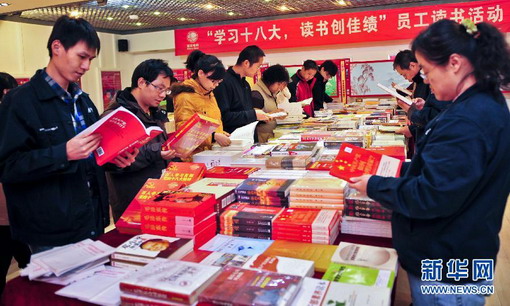 ????11月26日,國(guó)家電網(wǎng)天津城東供電分公司員工在企業(yè)活動(dòng)室選購(gòu)圖書(shū)。當(dāng)日,國(guó)家電網(wǎng)天津城東供電分公司將新華書(shū)店請(qǐng)進(jìn)企業(yè),開(kāi)展為期一周的“學(xué)習(xí)十八大讀書(shū)創(chuàng)佳績(jī)”員工讀書(shū)活動(dòng),讓電力員工不出單位便可及時(shí)便捷選購(gòu)黨的十八大文件及最新學(xué)習(xí)輔導(dǎo)讀物。 新華社記者 張超群 攝 |