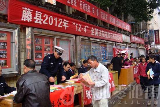 梧州零距離網訊(通訊員 朱庭源)為深入學習貫徹黨的十八大精神,全面落實做好“12?4”全國法制宣傳日,12月4日上午,藤縣公安局組織法制、禁毒、交管、刑偵、派出所等警種單位在河西電影院門前小廣場開展了主題為“弘揚憲法精神,服務科學發展”的法制宣傳咨詢活動,大力宣傳《中華人民共和國禁毒法》、《道路交通安全法》及有關法律法規。