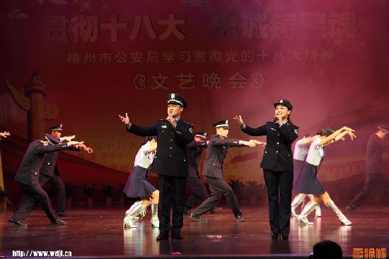 梧州零距離網(wǎng)訊(通訊員 曾亮)12月8日晚,市文化展覽中心流光溢彩、燈光璀璨,梧州市公安局在此隆重舉行“貫徹十八大 忠誠鑄警魂”—— 學(xué)習(xí)貫徹黨的十八大精神文藝晚會(huì)。現(xiàn)場一派喜慶熱鬧的景象,以載歌載舞的形式向黨的十八大獻(xiàn)禮,充分展現(xiàn)全市公安民警歡慶黨的十八大勝利閉幕的喜悅心情,同時(shí)掀起學(xué)習(xí)宣傳、貫徹落實(shí)黨的十八大精神的熱潮。