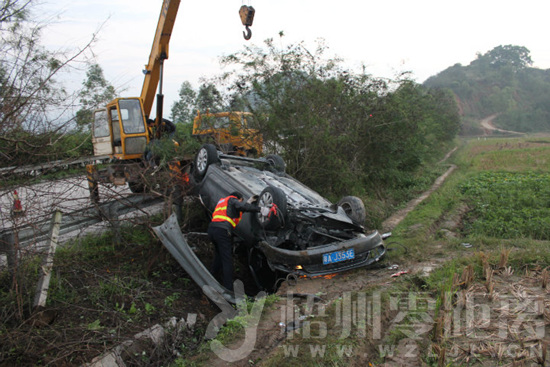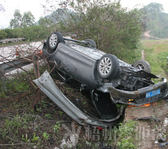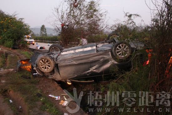 高速三大隊值班民警接到報警后,迅速趕赴事故現場,到達現場時,這臺粵A牌照的小車已經四腳朝天仰翻在高速公路排水溝里,擋風玻璃已經破碎、車頭受到一定程度的損壞,車身上有多處明顯的擦痕,高速公路旁的樹木也被該車撞倒。駕駛人表情呆呆地站在一旁,些許時間方回過神來。民警馬上聯合岑溪交警大隊民警在事故現場后面設置反光錐筒和提示標志,以防二次事故發生,并對事故現場進行勘察。
