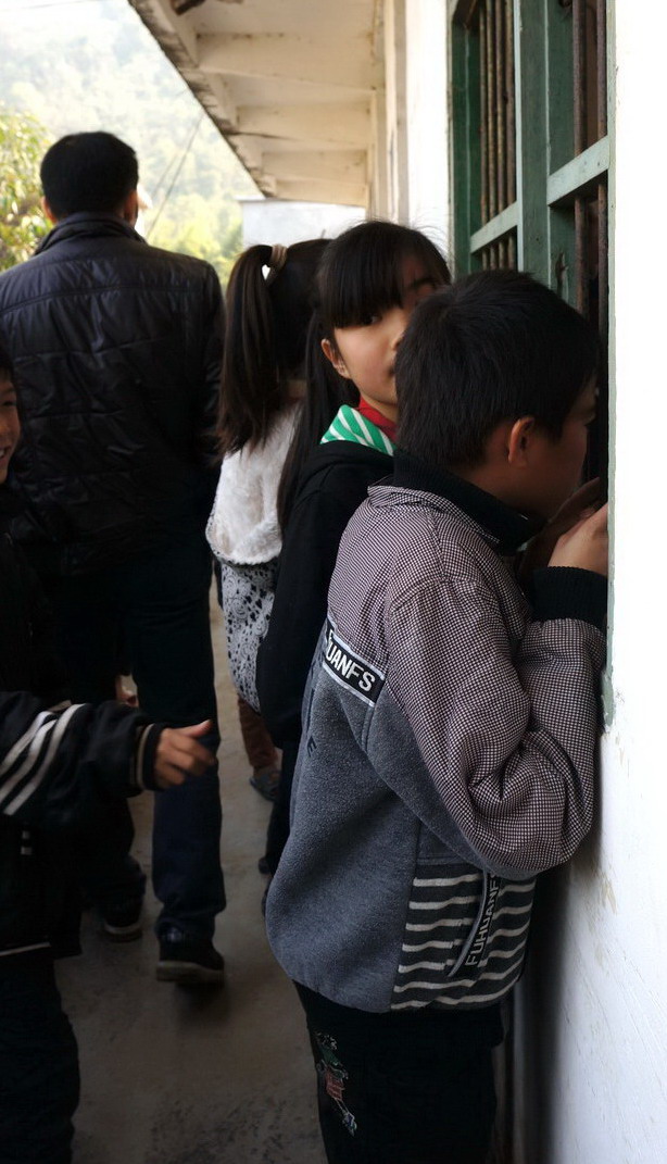 學生們在教室外密切關注著義工們在電腦室內的布置情況。黃祎婧/攝