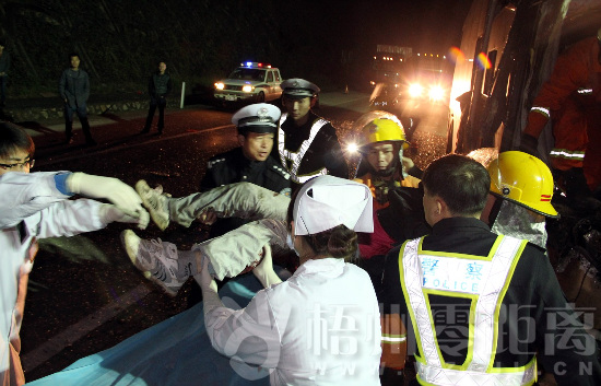 事故發(fā)生后,梧州市公安局黨委委員、交警支隊(duì)支隊(duì)長(zhǎng)唐劍鋒高度重視,啟動(dòng)應(yīng)急預(yù)案,立即調(diào)派高速、蒼梧交警趕赴現(xiàn)場(chǎng)展開(kāi)救援、疏導(dǎo)和分流,并趕赴現(xiàn)場(chǎng)一線指揮施救;聞警而動(dòng)的消防和醫(yī)療、路政等部門(mén)人員也迅速到位,經(jīng)過(guò)近一個(gè)小時(shí)的緊張施救,成功將被困傷員救出,并送往醫(yī)院接受進(jìn)一步治療。