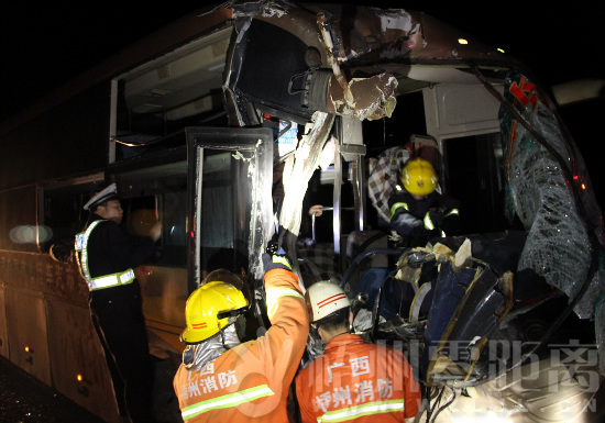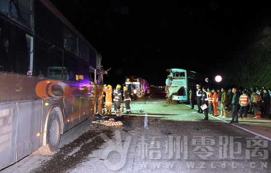 據(jù)了解,事故發(fā)生于包茂高速蒼梧岑溪段距新地出口3km往梧州方向。筆者在現(xiàn)場(chǎng)看到,撞碎的車(chē)窗玻璃和零件灑滿一地,兩輛粵A粵B車(chē)牌的小轎車(chē)一左一右橫在路面,粵A轎車(chē)后面有兩輛大客車(chē)追尾碰撞,首尾相“吻”,右邊一輛桂A車(chē)牌的藍(lán)色大客車(chē)“屁股”被撞掉一半,前輪陷入路邊溝渠,排在最后方的金色粵S車(chē)牌大客車(chē)被撞得最嚴(yán)重,車(chē)頭右側(cè)呈粉碎狀,且有一乘客的大腿卡在駕駛室旁無(wú)法動(dòng)彈,其時(shí),消防官兵正在利用破拆工具對(duì)事故車(chē)進(jìn)行破拆解體。