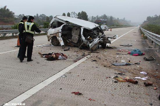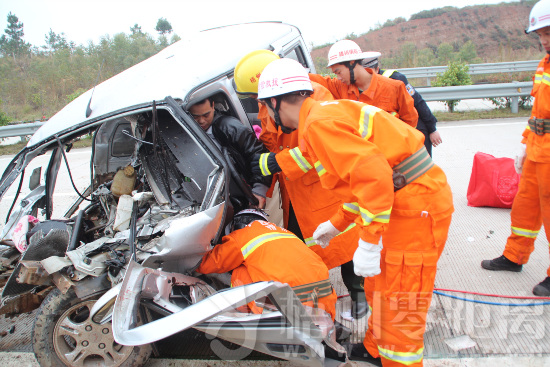 下午15時50分,岑溪消防大隊出動一輛搶險救援車和7名官兵前往救援。消防官兵到達現場后,現場一輛牌照為粵A5569R的面包車橫停于公路,面目全非。經過現場醫護人員鑒定,被甩車外的婦女以及駕駛室后座的小女孩當場死亡,另外2人已經由醫護人員和現場民警救出,受傷司機被變形的車頭卡住右腳。消防官兵立即展開救援,利用破拆工具對車頭進行破拆,再利用液壓擴張鉗和液壓頂桿對卡主司機腳步的車頭進行擴張。經過半小時的緊張救援,被困人員被成功救出,并轉交現場醫護人員救治,遇難者的遺體也移交相關部門處理。