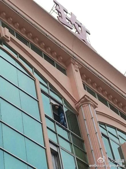 輕生男子站在窗臺上,身體大部分已伸出窗外。