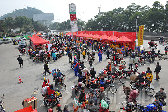 今年春運經梧州交警支隊積極協調,梧州市人民政府將東出口春運服務站作為民心工程,由市政府牽頭、各部門密切配合、社會各界力量積極參與、志愿者駐站服務,為返鄉鐵騎大軍提供姜茶,漢堡包、八寶粥、方便面等免費食物和免費醫療服務,同時還有手機充電、Wi-fi無線上網、親情電話等供返鄉鐵騎休憩使用。梧州市參照東出口春運服務站模式,在務工人員返鄉路途中的蒼梧、藤縣國道卡口設立春運服務站,在三個服務站之間的中石化、中石油加油站廣場設立春運服務點,在每個服務點之間設立流動服務車,通過流動服務車,將服務點、服務站串連起來,點、線、面結合,最大限度的覆蓋返鄉摩托大軍的返鄉路線,確?!拌F騎行千里、愛心不掉隊”。據統計,春運期間,梧州各個春運服務站服務返鄉、返程摩托大軍約有50萬輛次。在1月25日至2月9日,進入梧州春運服務站休息的返鄉鐵騎日均超過3000多輛次。梧州春運服務站溫馨貼心的服務溫暖著鐵騎的漫漫返鄉路,這凸顯了政府對道路交通安全管理工作的重視,體現了政府對返鄉務工人員的人文關懷,展現梧州市互助、友愛、包容、奉獻的人文精神。