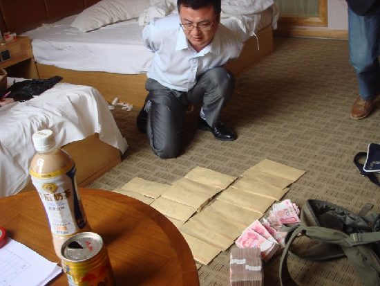 警方在賓館抓獲傳銷頭目,查扣涉案財物。