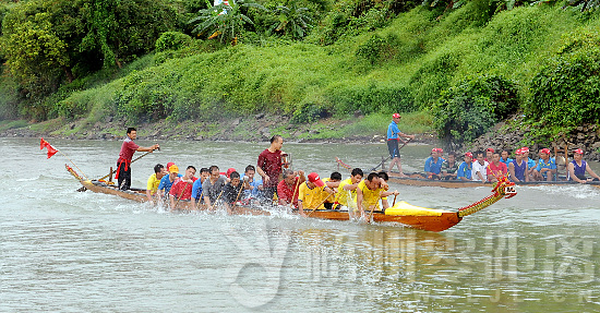 6月5日下午,在赤水龍舟隊隊員(右船)的注視下,赤水青年隊(左船)在潯江江面上逆水訓練體能。