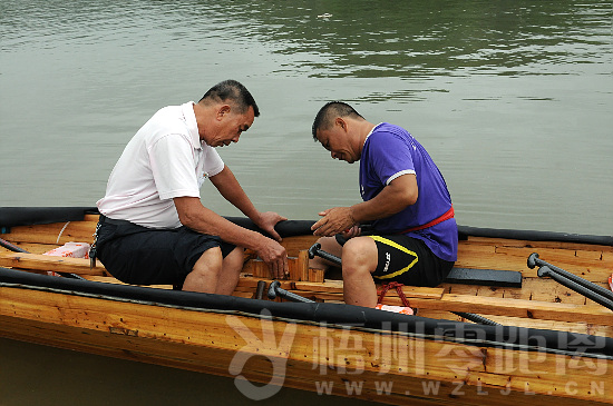 赤水龍舟隊兩名經驗豐富的師傅正在調試龍骨。龍骨是整艘龍舟最重要的部分,是拼湊龍舟的一塊長條木板,龍骨質量的好壞和松緊度會對了龍舟行進的快慢產生影響。