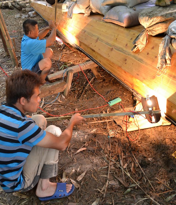6月6日中午,藤縣塘步鎮赤水龍舟隊的隊員調較龍舟,手持太陽燈為船體加溫。經過一年的日曬雨淋,每條龍舟都會稍微變形。
