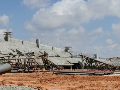 ????7月9日,在梧州市體育中心體育場(chǎng)施工現(xiàn)場(chǎng),項(xiàng)目工程負(fù)責(zé)人介紹說,目前體育場(chǎng)磚砌體工程中的西看臺(tái)建設(shè)已完成了80%,東看臺(tái)建設(shè)也完成了50%。目前,同時(shí)在進(jìn)行當(dāng)中的是鋼結(jié)構(gòu)的拼裝,拼裝工作將在8月中旬完成。