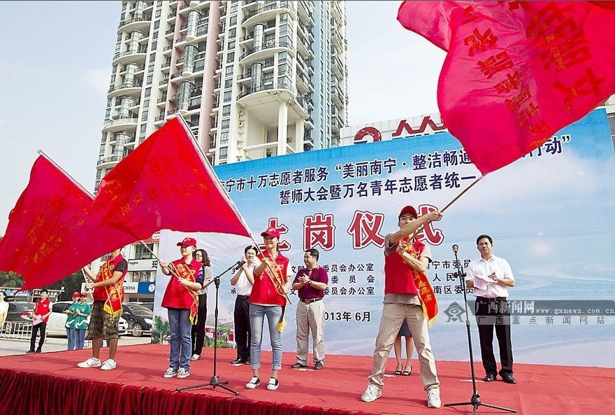 ????6月22日,南寧市舉行10萬名志愿者服務“美麗南寧·整潔暢通有序大行動”誓師大會暨萬名青年志愿者統一上崗儀式。圖為分工不同的4支青年志愿者服務隊在接受隊旗。記者 覃世默 楊素顏 攝(廣西新聞網-廣西日報)