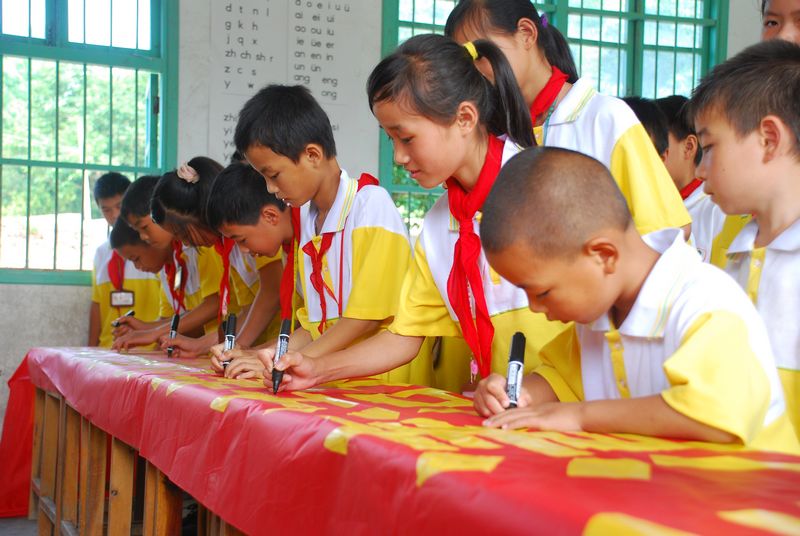 5月24日,蒙山縣西河鎮壬山小學的學生在“美麗蒙山·清潔家園·爭當環保小衛士”橫幅上簽名。在開展“清潔鄉村”活動中,蒙山縣發動中小學學生參加,以“小手拉大手”的形式當好宣傳員,并參加力所能及的環境清潔勞動。目前,該縣已有7500多名中小學學生加入這項行動。