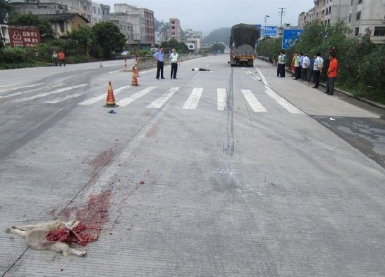 為了撿一條死狗無視交通法規,結果丟掉了自己的性命。交警部門提醒廣大駕駛員,為了生命的安全,請自覺遵守交通法規! |