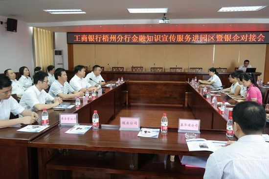 ???? 2013年7月26日,工行梧州分行聯合梧州工業園區管委會,到工業園區舉辦金融知識宣傳服務進園區暨銀企對接會。該行蔡山行長、徐雄偉副行長,梧州工業園區管委會陳紹霖主任,以及20多家園區企業負責人、財務經理出席了對接會。