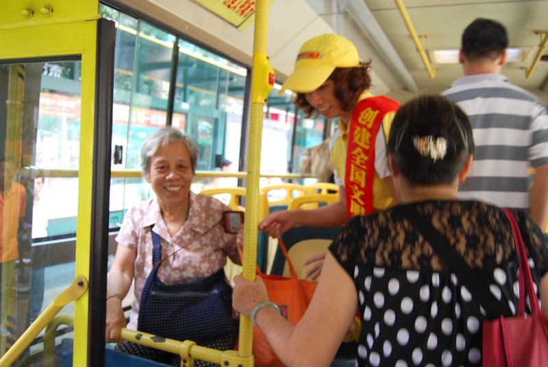 9月19日,公交文明志愿者幫助一名乘車的老婆婆找到座位。